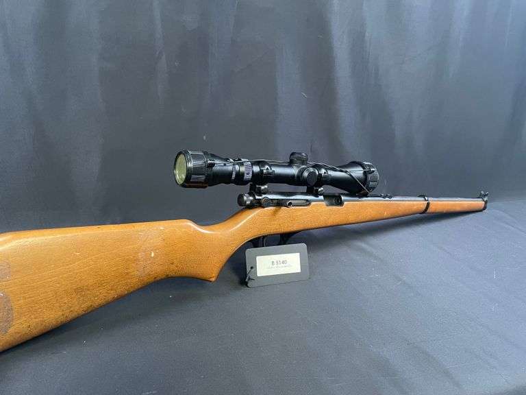 H&R Model 755 SAHARA 22 S-L-LR Cal Carbine with scope, Wood Mannlicher stock, adjustable rear sight, 18" Barrel. Has rust and signs of wear, and has sticker residue on stock. Manufactured 1963-1970.
